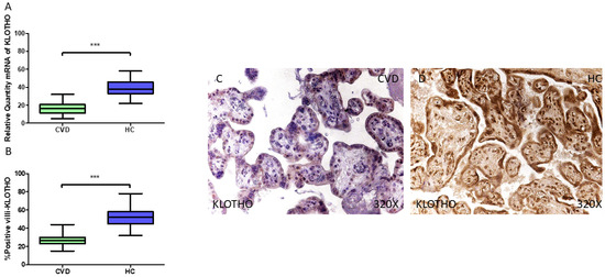 (A) KLOTHO mRNA expression levels in pregnant females who were diagnosed with CVD compared to HC group (*** p < 0.0001). (B) IRS scores assessing KLOTHO expression in placental tissue of women with CVD and without this condition (*** p < 0.0001). (C,D) Representative immunostaining images displaying KLOTHO expression in placental villi from CVD and HC samples.