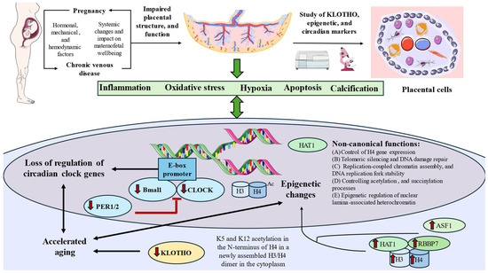 On the other hand, aging is an inevitable physiological process that occurs in all tissues, including the placenta, which has a strictly limited lifespan of 40 weeks. While placental aging is a natural part of pregnancy necessary for labor induction, its premature or delayed occurrence is linked to complications, such as preeclampsia, preterm birth, stillbirth, and other placental dysfunctions, highlighting the importance of understanding its molecular mechanisms in relation to both pregnancy outcomes and long-term health [27]. In this sense, alterations in the anti-aging protein KLOTHO within the placenta may indicate accelerated aging, further exacerbating placental dysfunction as demonstrated in previous works [28,29]. To the best of our knowledge, there are no studies specifically exploring possible disturbances in circadian rhythms, epigenetic regulation, and aging in the placental tissue of women who develop and suffer from CVD during pregnancy. Understanding how these mechanisms are disrupted in women with CVD during pregnancy could provide key insights into disease progression and potential therapeutic targets.