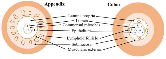 Furthermore, the appendix might play a role in “educating” the immune system to distinguish between beneficial and harmful bacteria [2]. By encountering diverse bacterial populations within the appendix, the immune system can learn to tolerate beneficial bacteria while remaining vigilant against pathogens [10]. This training of the immune system is thought to contribute to developing lenience, precluding the immune system from exaggerating to harmless elements, which can lead to allergies and auto-immune diseases (ADs) [58,59,60].
