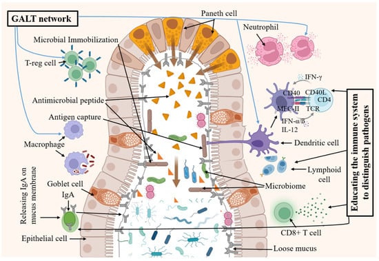 There are several ways in which AM can interact with the immune system. Certain bacterial strains within the AM can promote the development of Tregs, a specialized subset of immune cells that suppress excessive immune responses and maintain tolerance to commensal bacteria. For instance, Lactobacillus rhamnosus stimulates the cell proliferation rate of bowel epithelial cells, enhances repairing of the mucosa damage caused by radiotherapy and/or chemotherapy, helps maintain bacterial equilibrium within the bowel, and inhibits bacterial translocation into the tissues [69,70,71]. This helps prevent autoimmune reactions against the body’s own tissues [72,73]. In response to Lactobacillus, epithelial cells increase the extracellular expression of MUC3 mucin which limits the adhesion of pathogens like enteropathogen E coli E2348/69 [70]. A similar result was reported with Lactobacillus casei GG which reduces the adhesion of E. coli C25 in epithelial cells [69]. The appendix’s lymphoid tissue provides a niche for the maturation of B and T lymphocytes, the key players in the adaptive immune response. These immune cells learn to recognize and respond to foreign antigens (substances that trigger an immune response) while remaining tolerant to self-antigens [74]. The appendix epithelium produces significant amounts of IgA, a type of antibody that neutralizes pathogens on mucosal surfaces (surfaces like the lining of the gut) and prevents them from adhering and causing infection (Figure 2) [75]. This localized immune response within the appendix complements the broader immune activities of the gut. Defects in IgA production cause increases in specific bacterial taxa like Bacteroides in the progression of colitis [76]. These findings are also supported by recent studies. In one recent study, the association of appendectomies with an increased risk of colitis-associated cancer (CAC) was examined using five-week-aged male BALB/c mice. The results showed that UC patients with a previous appendectomy had decreased intratumor CD3+ and CD8+ T-cell densities compared with UC patients without a previous appendectomy [77].