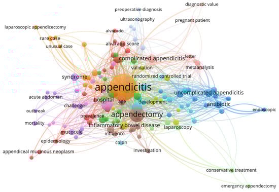 Bibliometric analysis of appendectomy literature and keyword analysis. Data on the impact of appendectomy on different disease outcomes were retrieved from the PubMed database. This VOSviewer network analysis, conducted using VOSviewer version 1.6.20 and the dimensions research publication database, considers 1720 published studies from the period 2020 to 2024 on appendectomy and related diseases. The analysis was performed based on 148 keywords selected from these publications, and 12 found distinct clusters were found within key terms. The visualization illustrates the interconnectedness of various terms in appendicitis research, highlighting key themes such as diagnostic tools, treatment approaches, and emerging trends. Central terms like appendicitis, appendectomy, and differentiations between complicated and uncomplicated appendicitis are featured. The network also underscores the geographical and temporal diversity of the research, emphasizing the collaborative efforts in addressing appendicitis. This comprehensive network analysis provides valuable insights into the evolving appendicitis research and its implications for advancing diagnostic and treatment strategies.