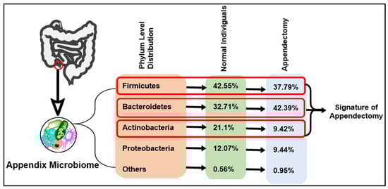 Studies investigating the microbial composition of the human appendix have revealed a rich and diverse ecosystem predominantly comprising four major phyla: Firmicutes, Bacteroidetes, Actinobacteria, and Proteobacteria [17,18]. This microbial consortium exhibits dynamic interactions, forming intricate networks that influence various aspects of host physiology, including nutrient metabolism, immune modulation, and pathogen resistance [12,19,20].