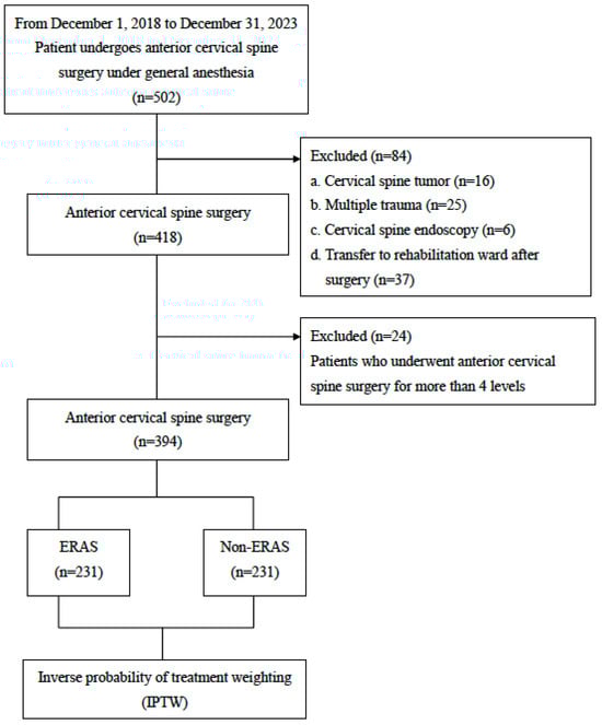 This retrospective study was conducted at the Kaohsiung Medical University Hospital (KMUH), Kaohsiung, Taiwan, and approved by the Institutional Review Board of the KMUH (KMUHIRB-E(II)-20240268). This study analyzed the electronic medical records from the KMUH for all patients aged 20 to 80 years who underwent general anesthesia for first-time ACSS due to cervical radiculopathy and/or myelopathy caused by degenerative disc disease and/or cervical spinal canal stenosis over a 5-year period (1 December 2018 to 31 December 2023). The study population was divided into two groups: those managed with an ERAS protocol and those without (Figure 1).