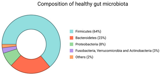 Composition of gut microbiota. Firmicutes and Bacteroidetes are the most represented phyla. Proteobacteria, Fusobacteria, Verrucomicrobia, and Actinobacteria. Created in BioRender.
