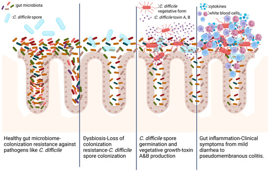 C. difficile is found in two forms: the vegetative form and the spore form that is resistant to antibiotics and responsible for its transmission. The disease develops when the spores colonize the gut, develop into vegetative cells, and produce toxins such as toxin A (TcdA), toxin B (TcdB), and, less commonly, binary toxin (CDT). These toxins trigger several biological mechanisms that result in fluid secretion, inflammation, and tissue destruction, which in turn causes CDI symptoms like diarrhea and stomach pain. The development of CDI depends on disruptions in the gut microbiota, and recovery depends on restoring the diversity and abundance of homeostatic bacteria. Therefore, in recent decades, interest in the microbiome and in the microbiota has grown as a potentially promising area for the therapeutics of CDI [2].
