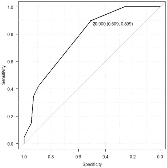 Receiver operating characteristic curve of the dosage of loop diuretics at baseline for predicting dose reduction in loop diuretics. The mean area under the ROC curve and 95% CI for the dosage of loop diuretics at baseline was 0.774 (95%CI 0.697–0.851). The cut-off value for loop diuretics at the time of initiating dapagliflozin based on the ROC curve was 20 mg/day, with a sensitivity of 0.509 and specificity of 0.899.