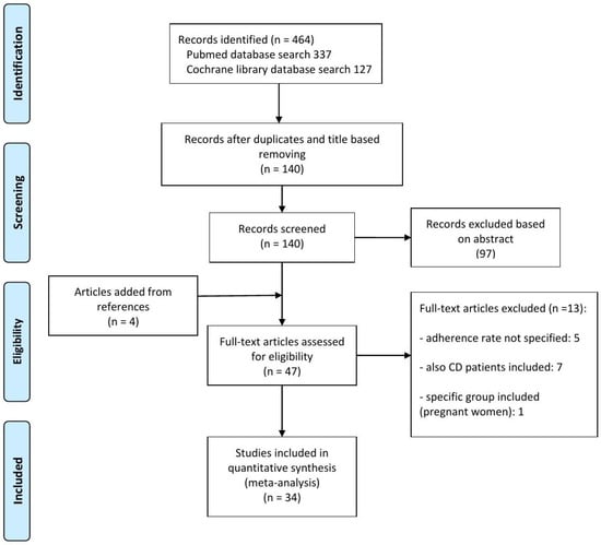 From an initial result of 464 articles, 324 articles were excluded by only removing duplicates and reading the title, and a further 97 after reading the abstract. Finally, after full text examination, 34 articles were included in the meta-analysis [6,10,11,12,13,14,15,16,17,18,19,20,21,22,23,24,25,26,27,28,29,30,31,32,33,34,35,36,37,38,39,40,41,42] (Figure 1). Regarding study type, 16 studies (47%) are observational, and 18 (53%) are clinical trials. Among the latter, adherence is considered as the primary endpoint in six studies (33%), the non-primary endpoint in three studies (17%), and in nine studies (50%) it is not considered as the endpoint. Considering geographic area, 12/34 (35%) studies are from North America, 14/34 (41%) are from Europe, 4/34 (12%) are from Asia, and 4/34 (12%) are from mixed areas worldwide. Most of the studies are multicentric (24/34, 71%), while consistent variation is observed regarding the method of assessment of adherence: by questionnaire or diary (8/34, 23.5%); by count of prescription/tablets/refills (17/34, 50%); by urinary drug excretion measurements (1/34, 3%); or by multiple methods or not specified (8/34, 23.5%). Characteristics of the included studies are summarized in Table 1.