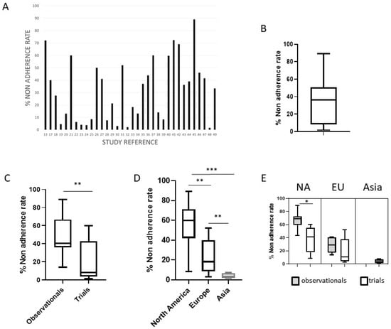 The non-adherence rate in published studies. (A) The non-adherence rate (%) in the 34 studies included in the meta-analysis; (B) box plot with representation of the upper and lower values, median, and interquartile range for the non-adherence rate in the included studies; (C) the significant different non-adherence rate in observational studies vs. trials; (D) the significant different non-adherence rate in studies from North America, Europe and Asia; (E) considering separately observational studies and trials in the different geographic areas, significant difference emerged in North American studies. NA = North America, EU = Europe, * = p < 0.05, ** p < 0.001, *** = p < 0.0001.