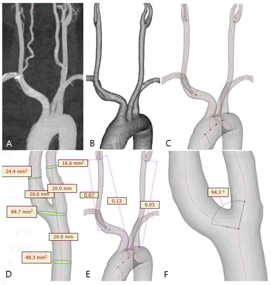 The CTA images of patients (Figure 1A) were collected in the Digital Imaging and Communications in Medicine (DICOM) format and transferred to semi-automated software (Materialise MIMICS v25.0; Materialise NV, Leuven, Belgium) for 3D reconstruction. The carotid system was segmented using different methods, including thresholding, region growing, and manual segmentation, to achieve the desired model (Figure 1B). The final 3D model of the carotid system included the aortic arch, brachiocephalic trunk, bilateral CCA, carotid bifurcation, ICA, and external carotid artery (ECA). Other small branches were excluded from the model. The model was then fine-tuned for optimal resolution; the surface was smoothed to reduce noise. The centerline from the aorta to both the ICA and ECA was automatically generated as a continuous line through the centers of spheres with the maximum radius that could fit within the corresponding vessel lumen (Figure 1C).