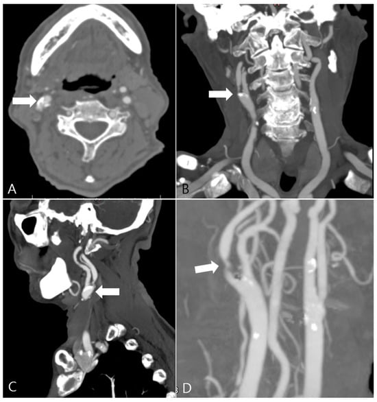 Figure 2. Representative case of carotid stenosis. Carotid computed tomography angiography (CTA) images of a representative patient with a carotid plaque causing severe stenosis in the right internal common carotid artery (arrows), visible in the axial plane (A), coronal plane (B), sagittal plane (C), and maximum intensity reconstruction (D).