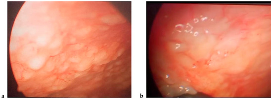Video-assisted thoracoscopy. Multiple, irregular, and white-coloured nodules in the middle (a) and infefior (b) parietal pleura.