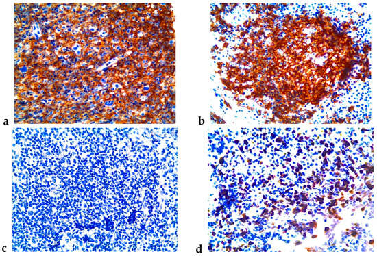 Immunohistochemistry. Deparaffinised tissue sections were subjected to antigen retrieval and incubated with monoclonal and/or polyclonal antibody panels. A biotin-free visualisation technique was employed using a peroxidase–polymer complex and DAB as a chromogen. (a) LCA (Leukocyte common antigen) (+); (b) CD20 (+); (c) CK (Cytokeratin) (−); (d) KI67 (+).