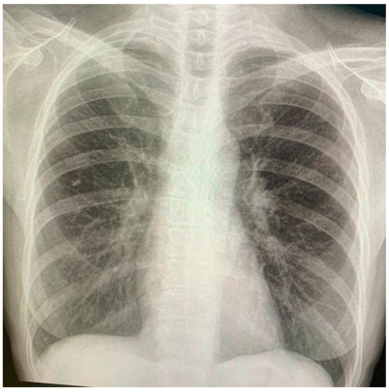 The patient received eight cycles of chemotherapy consisting of cyclophosphamide 750 mg, doxorubicin 50 mg, vincristine 1.4 mg, and dexamethasone 20 mg, combined with rituximab 375 mg every 21 days, with a significant clinical and radiological response. No respiratory or constitutional symptoms were reported during the one-year follow-up period. Seven months after the chemotherapy completion, a PET-CT scan showed no evidence of 18F-fluorodeoxyglucose (FDG) uptake. A follow-up chest X-ray one-year post-treatment revealed no evidence of pleural or pulmonary lesions (Figure 5). There was no recurrence of pleural effusion. Given the favourable outcome, the patient was maintained without further treatment, with continued clinical and radiological follow-up.