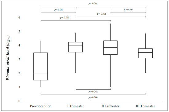Median PVL was 3.67 log (IQR: 3.27–4.18; min–max: 1–5.56) in the whole population, with significant differences across groups (p < 0.001) (Table 1). After Bonferroni adjustment for multiple testing, a p value ≤ 0.0083 (0.05 ÷ 6) was considered to indicate statistical significance. Third-trimester infections had significantly lower viral loads when compared with first-trimester infections (p < 0.001) (Figure 1). In detail, 3rd trimester median PVL value was 3.1 and 2.3-fold lower compared to those of 1st and 2nd trimester, respectively. Preconceptional infections exhibited PVLs significantly lower compared to each trimester of pregnancy (Figure 1). The distribution of PVLs across the four groups is illustrated by means of boxplots in Figure 1. Negative PVL values were 4/110 (3.6%) in our population, and 6/110 (5.4%) PVL values were under the LoQ of the assay.