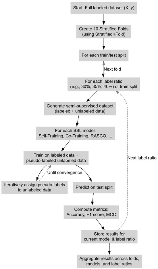 During training, self-labeled methods such as Self-Training, Co-Training, and RASCO iteratively assign pseudo-labels to the unlabeled data to improve performance. These pseudo-labeled instances are incorporated into the training process in each iteration. After training on each of the 10 folds, performance metrics such as accuracy, F1-score, and MCC are computed on the held-out test fold. The procedure is repeated for all 10 folds and for each label ratio, and the final results are reported as the average across all folds. This approach ensures a robust and unbiased evaluation of each method’s generalizability and performance under varying levels of label scarcity. All models were implemented using a Gradient-Boosting Classifier [] as the base learner.