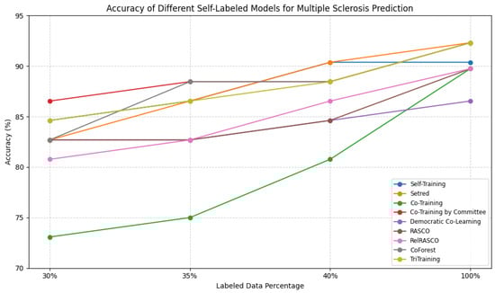 Multiple Sclerosis (MS) is a complex, chronic autoimmune disease of the central nervous system that leads to cumulative neurological damage []. MS has a wide range of symptoms, from fatigue and motor dysfunction to cognitive dysfunction and visual disturbances, and thus early and accurate diagnosis is crucial for effective intervention. Traditional diagnostic procedures rely on clinical examination, magnetic resonance imaging (MRI), and cerebrospinal fluid examination, but these processes are time consuming and may be variable. Machine learning (ML) has been very effective in the field of medical diagnosis, with data-driven models that enhance prediction accuracy [,]. Of these, semi-supervised learning methods, which make use of labeled as well as unlabeled data, hold high potential for MS prediction, particularly in scenarios involving limited labeled medical data.