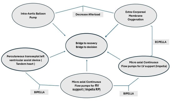 - Vlachakis, P.K.; Theofilis, P.; Leontsinis, I.; Drakopoulou, M.; Karakasis, P.; Oikonomou, E.; Chrysohoou, C.; Tsioufis, K.; Tousoulis, D. Bridge to Life: Current Landscape of Temporary Mechanical Circulatory Support in Heart-Failure-Related Cardiogenic Shock. J. Clin. Med. 2024, 13, 4120. [Google Scholar] [CrossRef] [PubMed]