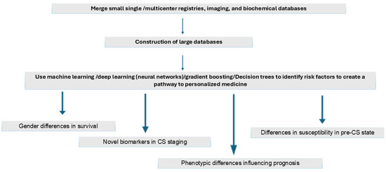 Figure 3 shows possible strategies to identify novel risk factors to identify CS at an early stage so that impending shock could be averted. The merging of single or multicenter databases containing images and laboratory data should help construct large databases on which many AI-driven/machine learning models such as neural networks and gradient boosting can work to identify novel risk factors to create effective risk prediction models and help pave the pathway to personalized medicine. Such models could possibly help discriminate the different CS phenotypes that have similar hemodynamic parameters. These approaches should help identify risk factors for gender differences in survival, arrive at a better staging system for pre-CS and identify phenotypic differences to help better prognosticate and finally define pathways that create differences in susceptibility in the pre-CS stage.