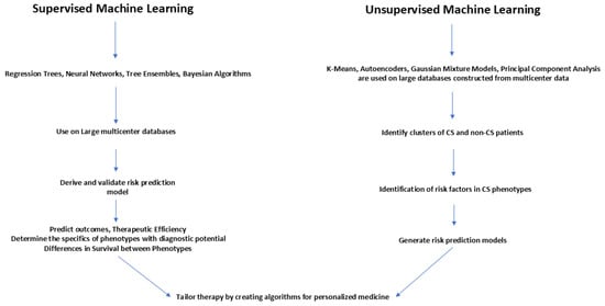 Figure 4 summarizes the use of machine learning in improving the management of CS phenotypes to generate AI-driven algorithms to identify CS phenotypes. Machine learning can be supervised or unsupervised. Supervised machine learning could be used on labeled data to train prediction models. Unsupervised machine learning uses unlabeled data to recognize patterns. Supervised learning is useful in classification and regression, and uses specific target variables for prediction. Unsupervised learning is used to detect hidden patterns in unlabeled data with no predefined outputs.