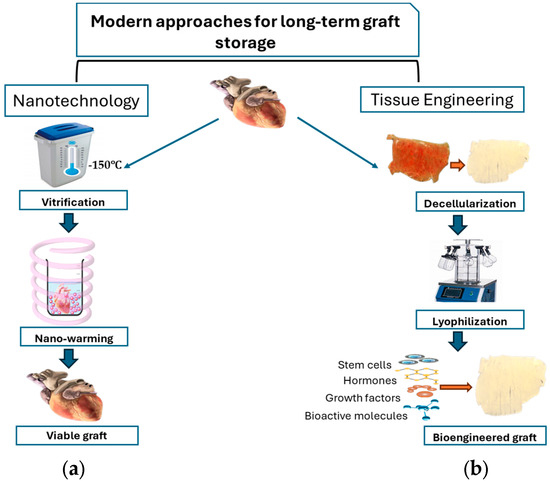 Although cryopreservation is a standard protocol used in clinical setups for the implantation of small tissue/organ grafts, for the larger tissues/organs, this method is not preferred due to the unrecoverable damage it may cause to their highly delicate structures. Additionally, cryopreservation allows for the preservation of graft tissue for a short span of a few days. The researchers have high hopes from the vitrification and nano-warming technique that it may bring about remarkable improvements for the ideal preservation of larger grafts and for longer time span, but it still needs a lot of optimizations, e.g., exploring more suitable vitrification solutions, efficient CPAs with minimum toxicity, and suitable nanoparticles alongside deep molecular understandings. The field of regenerative medicine is a novel approach for the ideal preservation of larger grafts by leveraging biological and engineering principles to improve graft availability and sustainability. By incorporating stem cells, bioactive molecules, growth factors, and hormones, the regenerative practices can not only maintain graft integrity but also promote tissue healing and the regeneration of injured cardiac tissue. Decellularization is considered to be one of the best approaches in regenerative medicine to attain the intact structural integrity of the graft while minimizing the risk of immune rejection and ensuring on-shelf availability for routine laboratory and clinical practices. However, it is very important to understand that both nano-warming and decellularization do not work independently but rather advanced approaches that complement and improve existing cryopreservation methods are needed.