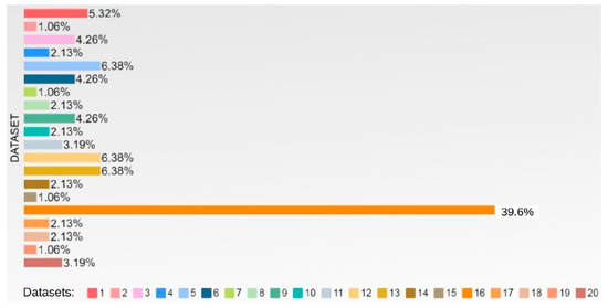 - A code was developed to identify the segments with combined data (from more than one dataset). The code identified 16,516 segments, which were subsequently eliminated. One of the negative consequences of the elimination of the 16,516 segments was the loss of 2 datasets (datasets 2 and 15). We analyzed the significance of the absence of these 2 datasets, and the following conclusion was made: Because users labeled datasets 2 and 15, their values were low in reliability. Due to the above and considering that the loss represented only approximately 1% of the total data, this was finally considered manageable.