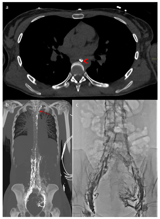 Four-dimensional CT lymphography showing the thoracic duct ((a)—arrowhead), diffuse involvement of the lymphatic network (b) with a “Medusa head” (arrow) aspect of the thoracic duct and lipiodol reflux to the pelvis (c).