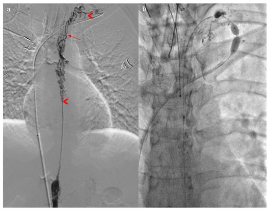 Lymphography (a) showing a “Medusa head” aspect of the thoracic duct (arrow) and two stenoses of the thoracic duct (arrowhead), which were impossible to dilate through angioplasty (b).