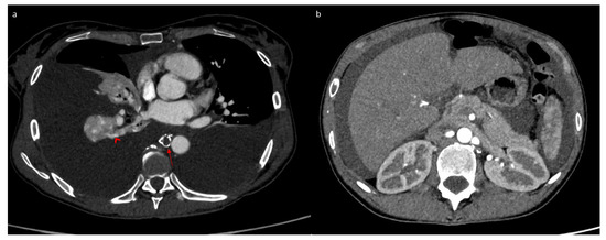 - Ghelfi, J.; Frandon, J.; Itkin, M.; Guiu, B.; Decaens, T. Acute Central Lymphatic Obstruction Associated with Decompensated Cirrhotic Ascites and Hydrothorax. J. Vasc. Interv. Radiol. 2023, 34, 1626–1629. [Google Scholar] [CrossRef]