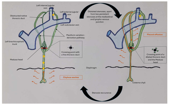 Lymphatic drainage is a dynamic process. When stenosis is present in the lower thoracic duct, chyle—mainly produced by the lower part of the body—accumulates in the abdomen. The smaller amount of chyle produced by the thorax can still flow and does not cause chylous effusion. Furthermore, the lymph has a different composition, with thick, milky lymph from the abdomen (high levels of triglycerides and chylomicrons) and more fluid lymph elsewhere. However, when the stenoses are relieved, chyle can progress through the thoracic duct, but the persistence of a non-dilatable stenosis at the lympho-venous junction leads to its accumulation in the pleura, after it has taken alternative pathways through other branches of a plexiform thoracic duct.