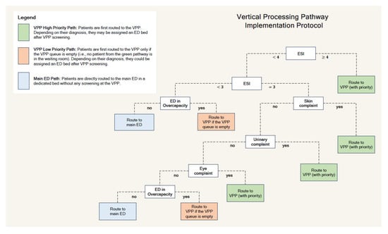 Based on the outputs of this framework, we analytically derived the optimal patient routing threshold that minimizes the time inefficiencies in the system. These thresholds vary dynamically with ED conditions, such as arrival rates and service speed. To operationalize this in practice, we used the analytical model to generate optimal routing labels across a range of empirically calibrated ED states, which were then used, in combination with the patient observations and the non-linear machine learning model predictions, to approximate the optimal patient routing policy. The approximation model resulted in a clinically interpretable and yet personalized decision tree protocol to operationalize VPP assignment in practice. Vertical examination priority was recommended for patients with an emergency severity index (ESI) of 4 or 5, as well as an ESI of 3s, with chief complaints involving skin, urinary, or eye issues. In periods of ED saturation—as defined by the institutional thresholds for patient volume and resource availability—the protocol recommended expanding VPP eligibility to all patients in the waiting room. The final protocol was summarized into a decision tree diagram used by EPs and triage staff during the trial (Figure 1) [5].