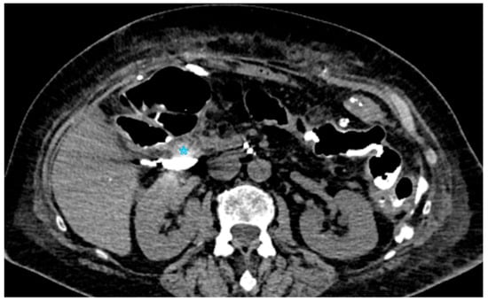 CT cholangiography through a Kehr tube showing the spread of contrast medium (blue asterisk) in the subhepatic region, anterior to the kidney, compatible with a biliary leak in a patient who underwent duodenopancreatectomy 5 days earlier.