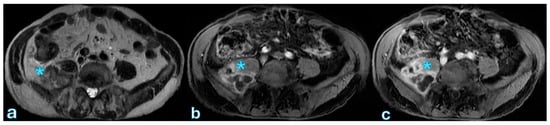 The MR T2-weighted image sequences (a), T1-weighted sequence after administration of contrast-enhanced arterial phase (b), and late phase (c) reveal a psoas muscle lesion with peripheral enhancement, which is consistent with an abscess indicated with blue asterisk. This finding was observed in a patient with fever and abdominal pain, 1 month after surgery for pancreatic adenocarcinoma localized to the body.