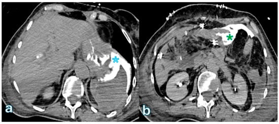 Axial CT with oral-administrated iodinated contrast showing the spread of extraluminal water-soluble contrast medium in a patient who underwent duodenopancreatectomy 3 days earlier. Oral contrast leakage is observed at the level of the gastrojejunostomy ((b) green asterisk), with distribution in the perisplenic region ((a), blue asterisk). These findings are indicative of gastrojejunostomy anastomosis dehiscence.