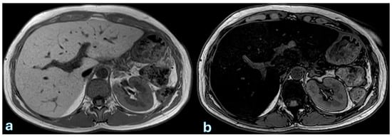 MR T1-weighted image sequences acquired in-phase (a) and out-of-phase (b) showing a marked signal drop between the in-phase and out-of-phase sequences, consistent with diffuse hepatic steatosis. This finding was observed in a patient at the first follow-up, conducted one month after surgery for pancreatic adenocarcinoma located in the head.