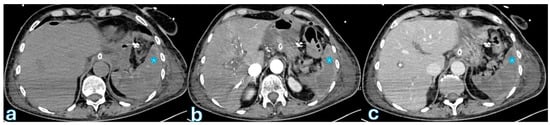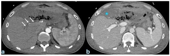 CT angiography of the abdominal vessels in (a) arterial and (b) portal venous phase showing nonopacification of the common hepatic artery (white arrows) and left portal branch, with subsequent ischemia of the corresponding liver parenchyma (blue asterisk). This finding was observed in a patient who underwent major pancreatic resection for pancreatic head adenocarcinoma four days after surgery and is consistent with embolization-induced liver infarction.