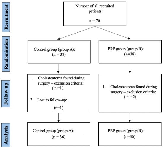 Seventy-six patients were recruited. During the surgical procedure, cholesteatoma, which is one of the exclusion criteria, was discovered in one patient from the control group and two patients from the PRP group. Therefore, these patients were excluded from the study. One patient from the control group did not attend the postoperative follow-up appointment and was thus excluded from the trial. In the final analysis, 72 patients were included, 36 from each group (Figure 1).