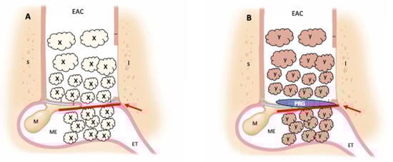 Surgical treatment. (A) Control group (classic tympanoplasty); (B) PRP group (tympanoplasty with addition of platelet-rich plasma and platelet-rich gel); red arrow—temporalis fascia; X—atelocollagen sponge with ciprofloxacin solution; Y—atelocollagen sponge with platelet-rich plasma and ciprofloxacin solution; PRG—platelet-rich gel; S—superior external ear canal wall; I—inferior external ear canal wall; EAC—external ear canal; ET—eustachian tube; M—malleus; ME—middle ear.