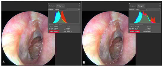 Evaluation of tympanic membrane perforation size. Adobe Photoshop© screen capture illustrates two marked areas: (A) the perforated region of the tympanic membrane circled, with the pixel count (63,663) displayed in the red quadrant; (B) the entire eardrum circled, with its pixel count (210,869) shown in the red quadrant. The percentage of perforation is calculated by dividing the number of perforation pixels by the total tympanic membrane pixels, resulting in a perforation percentage of 30.19% in this case.