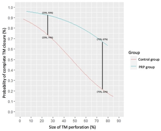 The probability of successful complete tympanic membrane healing in relation to perforation size for both the PRP and control groups. The perforation size is expressed as a percentage of the total tympanic membrane surface area. Legend: PRP—platelet-rich plasma. Note: Two key data points are presented. For perforations covering 25% of the tympanic membrane surface, the success rate of complete healing in the PRP group is 93% compared to 74% in the control group. For perforations covering 75% of the tympanic membrane surface, the success rate in the PRP group drops to 67%, while, in the control group, it is significantly lower, at just 22%. Detailed equations for the calculations are provided in Appendix A.