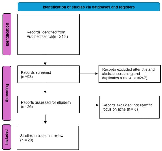 The systematic search identified 345 articles, with 98 studies undergoing full-text screening. Ultimately, 29 studies met inclusion criteria (Figure 1). The analysis focused on AI methodologies employed, datasets utilized, and the results achieved in acne diagnosis and severity grading. All the studies included in the review were retrospective. Among them, 13 (44.8%) relied solely on internal datasets, while 16 (55.2%) used publicly available datasets (ACNE04 [9] and AcneSCU [10]). Specifically, seven studies (24.1%) utilized only the ACNE04 dataset, one study (3.4%) used the AcneSCU dataset, five studies (20.7%) integrated ACNE04 with internal data, and one study (3.4%) combined ACNE04, AcneSCU, and internal data.