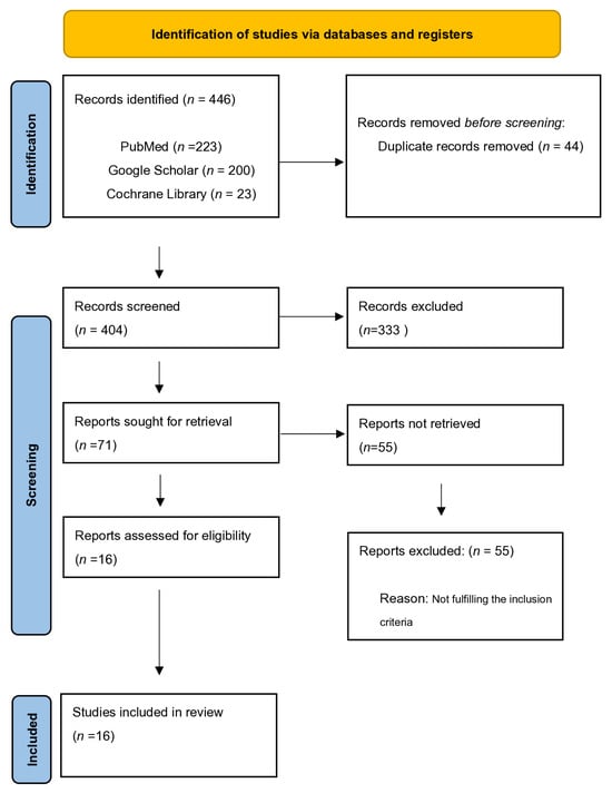 We conducted a systematic search and identified 446 publications that met our inclusion criteria (223 from PubMed database, 200 from Google Scholar, and 23 from Cochrane Library). After the removal of duplicates, 404 articles were retained. A total of 71 full-text articles were assessed for eligibility and included in this systematic review. However, after the application of exclusion criteria, 16 articles published between 2002 and 2024 [1,5,7,8,9,10,11,12,13,14,15,16,17,18,19,20,21] were selected for the final evaluation. The studies included 14 prospective observational cohort studies [1,5,7,8,9,10,11,13,14,15,16,17,18,20,21] and 2 placebo-controlled trials [12,19] (Figure 1).