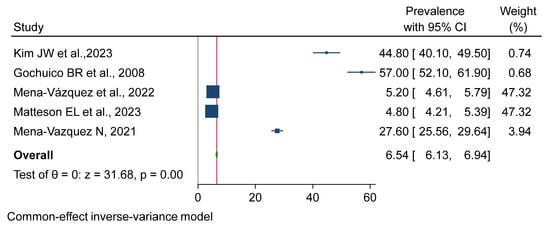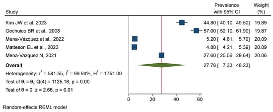 This distribution indicates the worldwide nature of the research contributing to this review. Follow-up over time to assess the outcomes of specific interventions or exposures was reported in three prospective cohort studies [5,7,8]. The high weights for Mena-Vázquez et al., 2022 [11], and Matteson EL et al., 2023 [12], suggest their data heavily influenced the overall estimate.) (see Figure 2).