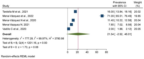 There is a very high degree of heterogeneity among the studies, as reflected in the individual prevalence estimates and the corresponding 95% confidence intervals and weights. The overall pooled prevalence was estimated to be 6.54% (95% CI: 6.13–6.94%) as validated by a z-test (p = 0.00). The very heavy weights assigned to the studies by Mena-Vázquez et al. [11] and Matteson E. L. et al. [12] indicate that their results have a significant impact on the final estimate. A forest plot was generated from a meta-analysis of the combined prevalence with a random-effects REML model. The analysis found considerable heterogeneity among the studies regarding prevalence (τ2 = 541.55, I2 = 99.94%). The pooled prevalence was 27.78% (95% CI: 7.33–48.23%), and the overall effect was statistically significant (z = 2.66, p = 0.01). The considerable heterogeneity indicates a significant degree of difference between the studies included, highlighting the need for a judicious interpretation of the pooled results (see Figure 2, Figure 3 and Figure 4).