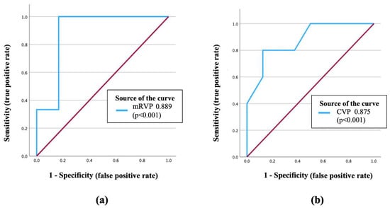 Receiver operating characteristic (ROC) curves of (a) median right ventricular pressure and (b) central venous pressure. AUC for median right ventricular pressure is 0.889 (p < 0.001) and 0.875 for central venous pressure (p < 0.001). CVP—Central venous pressure; mRVP—median right ventricular pressure.