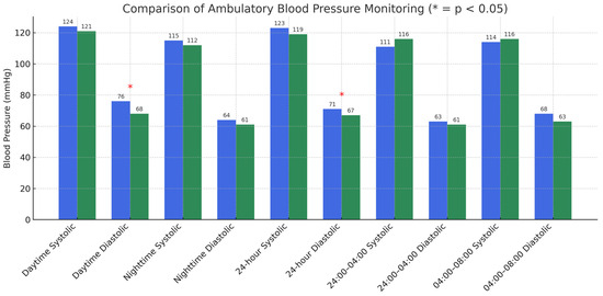 No significant differences were observed in SBP measurements, whether during the daytime, nighttime, or over the 24 h period. The nighttime diastolic pressure (p = 0.086) and blood pressure measurements during the 24:00–04:00 and 04:00–08:00 periods did not show significant differences between the two groups (p > 0.05). Those written in bold are statistically significant.