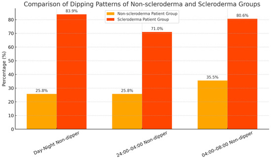 During the day–night interval, 83.9% of SSc patients exhibited a non-dipper pattern compared to 25.8% in the non-SSc group (p < 0.001). Similarly, in the 24:00–04:00 interval, non-dipping was observed in 71.0% of the SSc group versus 25.8% of the non-SSc group (p < 0.001). In the 04:00–08:00 interval, the non-dipper frequency was 80.6% in the SSc group and 35.5% in the non-SSc group (p < 0.001).