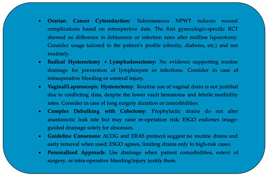 The present article discusses the efficacy and necessity of using drains in post-operative care, particularly in gynecologic oncology surgeries. It is suggested that negative pressure wound therapy may reduce the surgical site infection rates in patients undergoing cytoreductive surgery for ovarian cancer. It is highlighted that while vaginal drains may help with hematoma and infectious morbidity, the overall benefit of vaginal and peritoneal drains in preventing post-operative morbidity is questionable. Specifically, drains do not appear to improve the post-operative outcomes in women undergoing radical hysterectomy with pelvic lymphadenectomy, but they could still be reserved for high-risk situations, such as intra-operative bleeding or injury. However, their routine use may not be necessary and could lead to complications, particularly in cancerous patients with a history of chemotherapy or radiotherapy. Conflicting evidence exists regarding drains’ effectiveness in preventing anastomotic leakage, with high rates of re-operation and abscess formation noted. In any case, despite the rather non-supportive data on drainage placement for various types of surgeries for gynecologic oncology reasons, the final decision should be based on thorough consideration of individualized parameters, such as the radicality and duration of surgery, patient status, existence of obesity, diabetes and immunosuppression, in an effort to set the strategy for drainage placement in the overall framework of modern personalized medicine. The key insights are displayed in Figure 2.