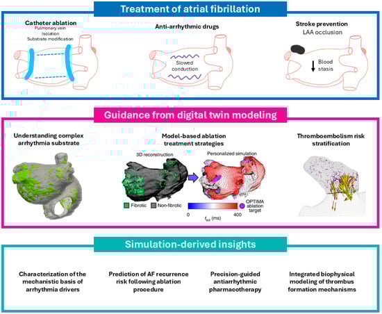 Clinical translation of digital twin modeling in atrial fibrillation. The top panel depicts established clinical strategies for atrial fibrillation (AF) management, encompassing catheter ablation, antiarrhythmic pharmacotherapy, and stroke prevention through anticoagulation. The middle panel illustrates the integrative role of digital twin modeling in augmenting therapeutic decision-making. Specifically, patient-specific models can be employed to delineate the arrhythmogenic substrate, simulate and optimize ablation strategies, and personalize stroke risk stratification. The bottom panel highlights the clinical insights gained through this approach, including mechanistic characterization of AF drivers, refinement of ablation targets, and individualized thromboembolic risk profiling. Collectively, digital twin modeling provides a mechanistic and patient-tailored framework that may enhance precision in AF therapy.