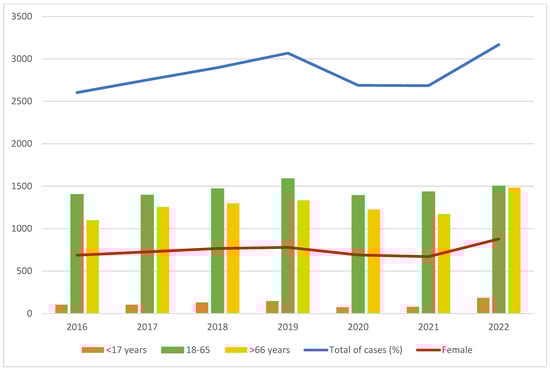 A total of 19,864 patients were diagnosed with PE between 2016 and 2022. The overall rate was 0.64 per 1000 hospitalizations, increasing steadily from 2016 to 2022, except for a slight decrease in 2021 (Table 1). The hospitalization rate for PE has increased by 20.3%, from 0.59 per 1000 admissions in 2016 to 0.71 in 2022. The number of PE cases segregated by sex followed the same pattern (Figure 1). More than half of the PE cases were diagnosed in patients aged 18–65 years (mean age, 61 years), and almost three in four patients were men. In 2022, there was an increase in PE in patients younger than 18 years. Most patients had no or low comorbidity, with a median CCI of 1.7 during the study period, which reached a maximum of 1.8 in 2021.