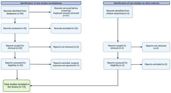 The study selection process is outlined in the PRISMA-ScR flow diagram (Figure 1). The initial search identified 96 articles, with an additional two articles obtained through manual searching. After duplicate removal, 47 abstracts were screened, and 23 articles underwent full-text review. Ultimately, 15 studies met the inclusion criteria and were included in this scoping review. Among them, nine studies reported outcomes of external DCR, while six studies focused on endoscopic DCR (Table 1).